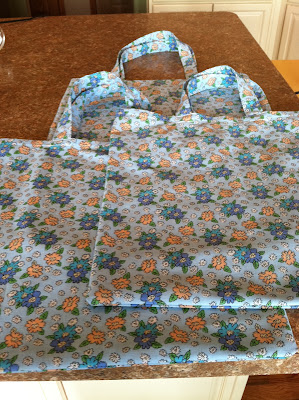 A few months ago after a lengthy hiatus (with the exception of a few poodle skirts), from the darkest corner of my storage closet, I located my sewing machine. My parents bought it for me many years ago and it still works like it's brand new. I used to sew my own clothes and whatever else I could find to sew up, but sewing sometimes seems like a lost art. My daughter has been asking me for months to show her how to sew, napkins are a great way to learn (see previous post just enter napkins in search this blog box).  I recently found some great buys on material and after my spring cleaning adventures I found some more items to repurpose; sheets, shirts, dresses, pillow cases and blankets. These are also great items to practice on because you don't have to spend too much money. Since I am tired of finding and throwing plastic bags away, I decided to make some inexpensive grocery totes that I could use then wash with my other laundry. I just don't like the material of the recycle bags you can buy at the stores.