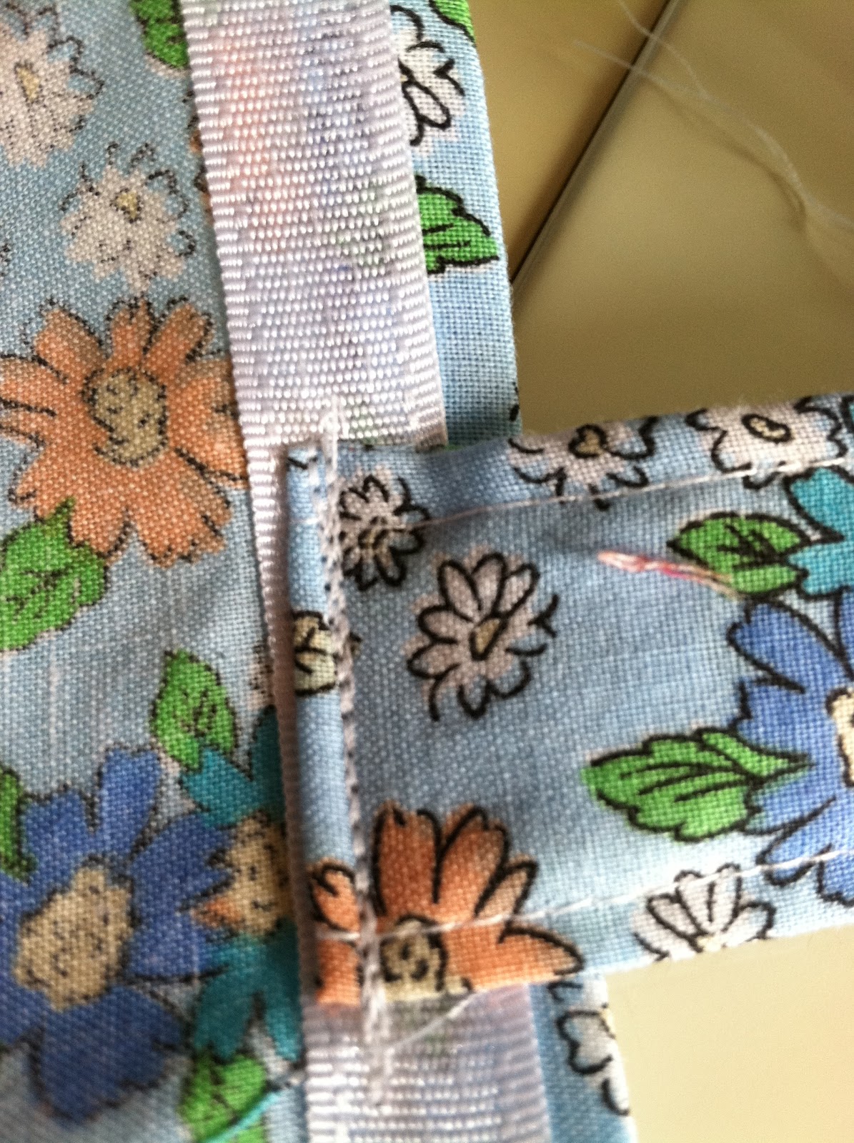 •  After I sew the handle on the inside, I go back over the seams to give it more strength. Then I sew toward the top of the bag, (you can do this on the right side of the material, top stitching or you can sew it on the inside) but on the handle so you reinforce the handle. I don't want my handles coming off with groceries in my tote! Repeat this for each handle.
