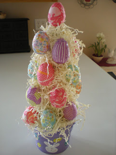 Start by cutting or tearing your paper napkins into small squares or strips.  If you are using glue, dilute it with a little water.  Using your paint brush, "paint" the pieces of napkin on the plastic eggs until the eggs are all covered. Depending on what paper you use, you can see the egg through some of them, this is where it might be nice to use the white eggs. (I think it just adds more color.)After they are dry you can hot glue them to the cone. I started at the top and went around the cone working my way down.  Then I filled in the open spaces with the shredded paper, placing glue wherever you need it.   I just set mine on the pail, last year I had it on a cake platter with pedestal. Look around and see what you already have that can be re-purposed.  Be creative and have fun!