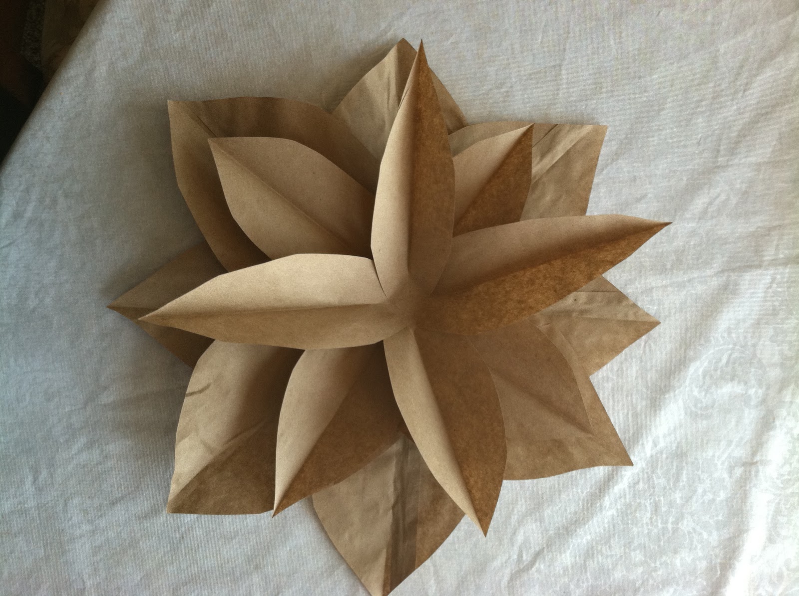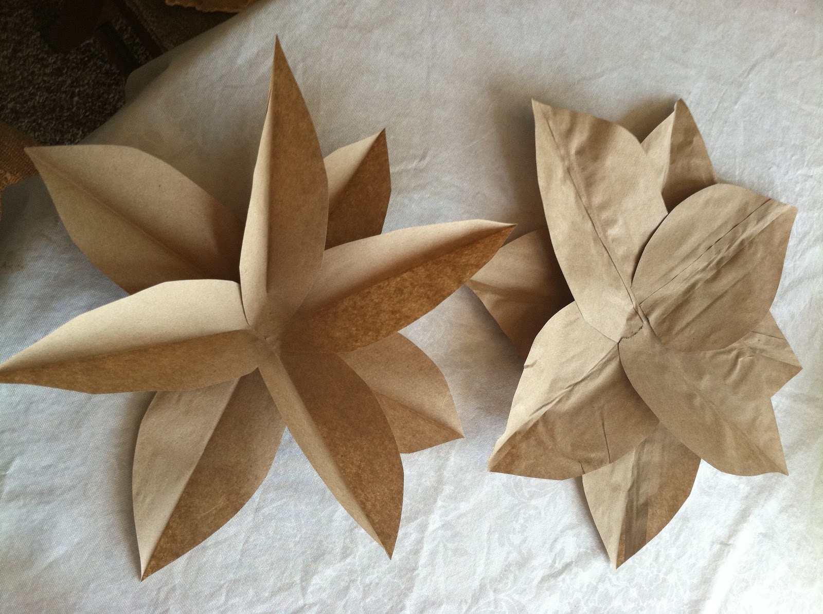 If you are looking for a simple, inexpensive DIY project this one is for you! I saw this project on the Nate Berkus Show, by Destiny at A Place for Us Blog and I loved it! She was on the House Proud segment (one of my favorites) and I loved her house and clever ideas. These decorative flowers are made from paper (lunch) bags! She used them as adorable decorations around a fake fireplace. I loved the idea but I was nervous surrounding my real fireplace with paper. So I decided to use mine in the doorway between my kitchen and hallway. My husband noticed them right away (which is unusual) but he thought I bought them! He didn't believe they were paper bags until I showed him (I always like that part)!