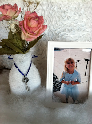 I am working on the graduation party centerpieces for the tables today. Since the theme is Shya's favorite things we are displaying pictures of her at different ages in white frames at each table. She loves clouds, funky shapes, light and fluffy stuff so we decided to use fluffy pillow batting under each centerpiece.