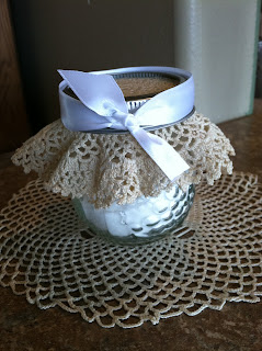 I filled my jelly jar about halfway full with baking soda and added 25 drops of orange essential oil. I picked orange because it's fresh and reminds me of summer but you can use any kind. Put the lid on your jar and shake for about 30 seconds. I removed the lid and placed a doily over the top, put the outside rim back on the jar and over the doily, then added a ribbon around the rim. It smells great, I'm going to make a couple more for the bathrooms. When you're jar doesn't smell anymore, you can add a teaspoon of cinnamon and use the mixture to clean your sinks. Just like grandma used to say, "waste not, want not." Have a wonderful weekend everyone and thanks for stopping by!