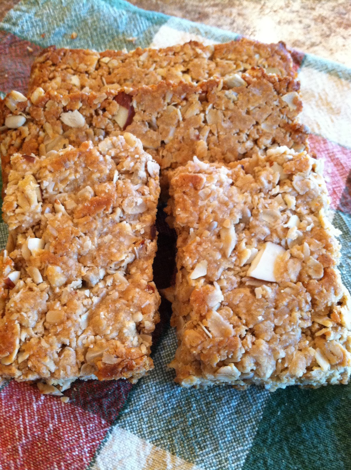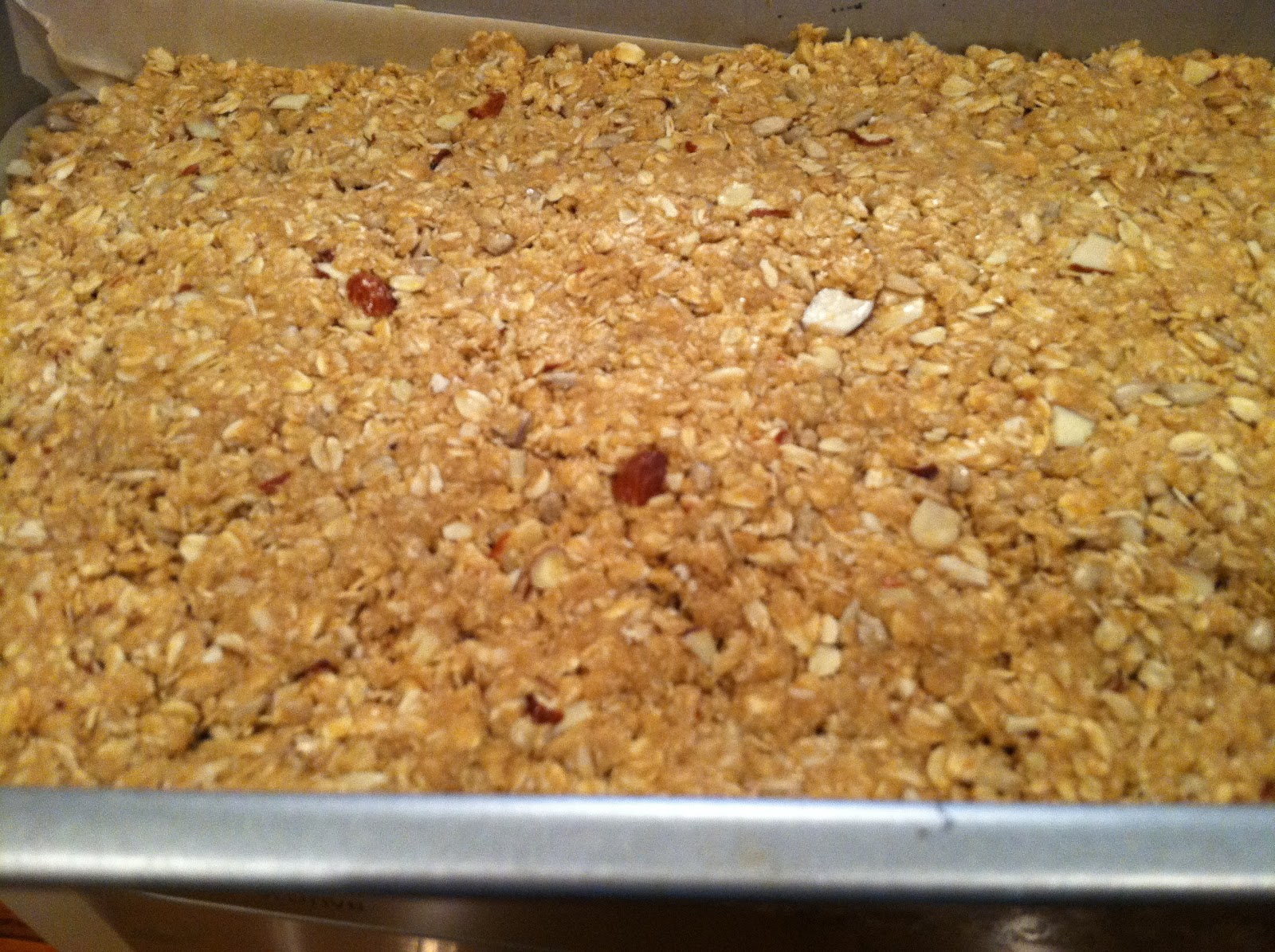 I mixed all of the ingredients in a large bowl with my hands, they should be almost a little sticky because you want them to stay together. Line a 9x13 pan with parchment paper and evenly pat the granola mixture into the pan, this will help them hold their shape after baking so they won't be so crumbly (you should expect a few crumbles though). I placed them in a preheated 300F oven for 15 minutes. Then I removed them from the oven and very carefully grabbed 2 ends of the parchment paper, then placed it on a cooling rack and cut the granola mixture into bars and squares before they cooled. I cut my bars down the middle (the length of the pan), then cut them the other way. I cut half of the granola into traditional granola shaped bars and the other half I cut into smaller squares. For me, they are better in small squares but the bars would be ok if you were eating them for a meal. I turned them over with a spatula and returned them to the oven for another 10 minutes. Then you can remove them from oven, let cool, and store in an airtight container. Enjoy your sort of crunchy, sort of chewy, healthy, nutty granola bars!