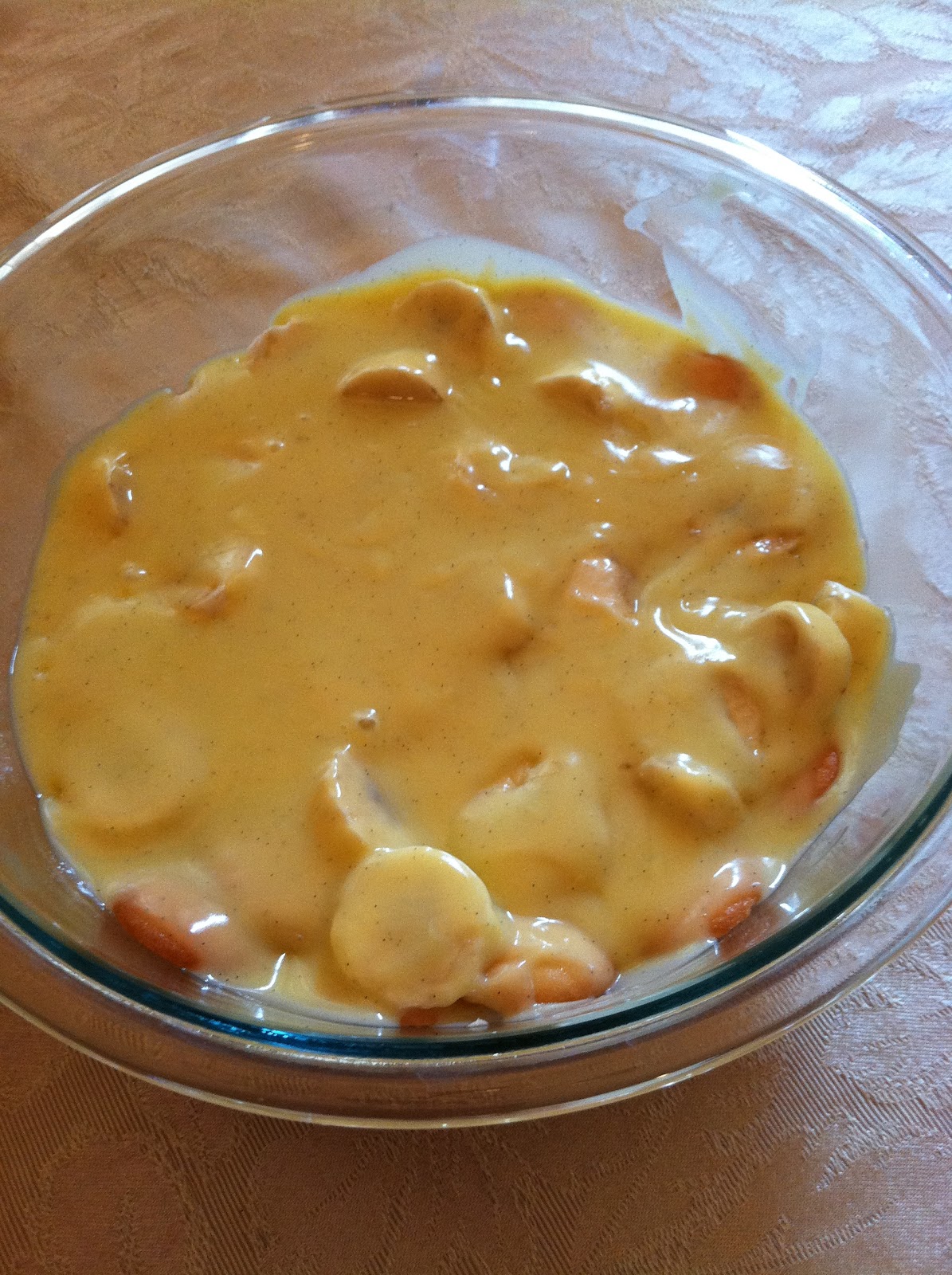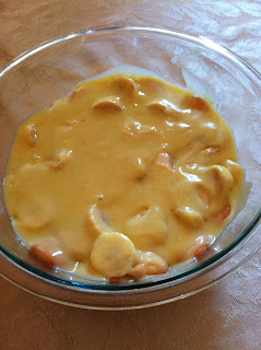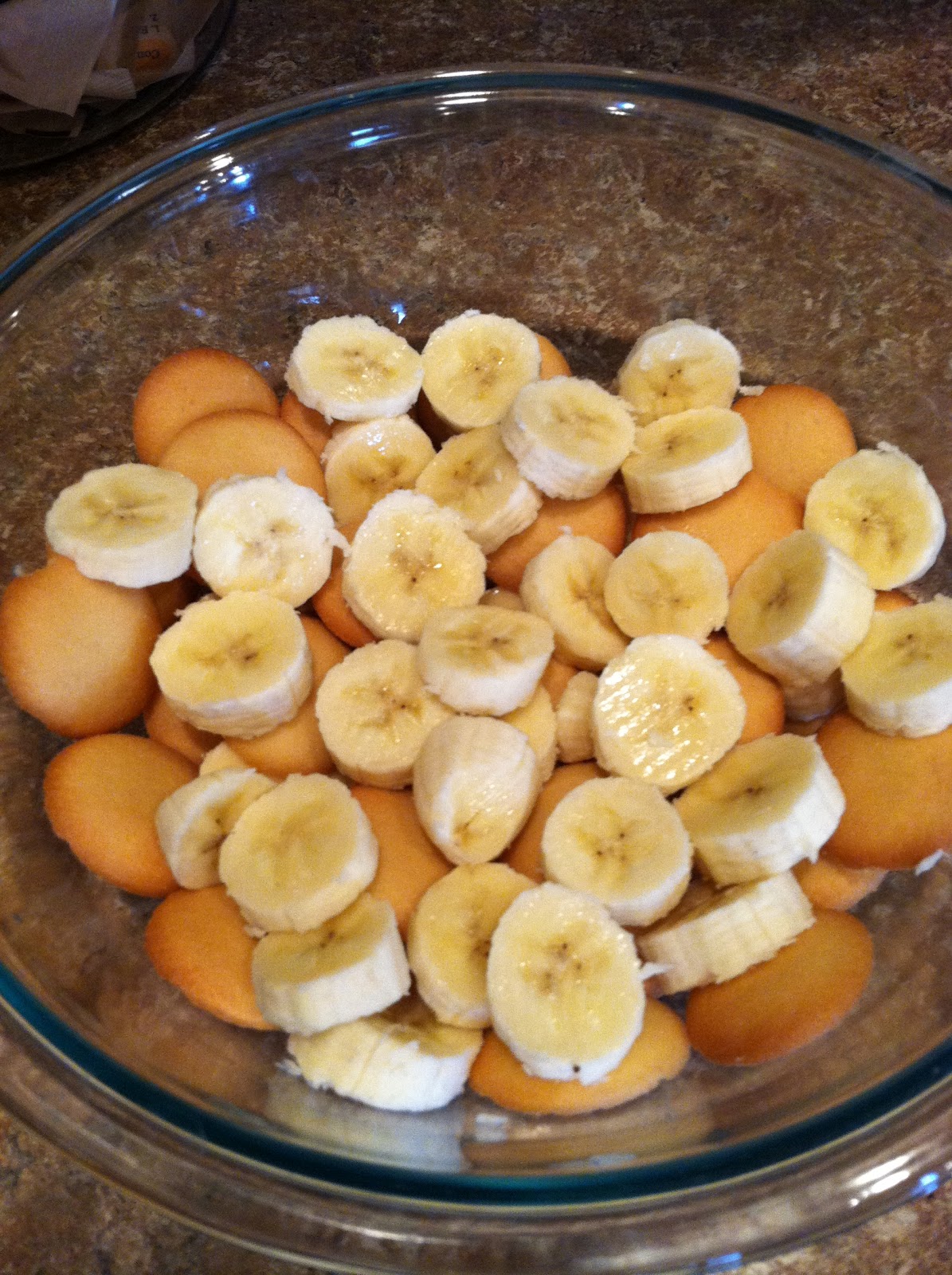 Before you start cooking your pudding, line the bottom and sides of a medium size bowl or pan with vanilla wafers. Slice your bananas and place over the vanilla wafers. Then repeat, I make 2 layers and end with bananas on the top. Now it's time to make the pudding.