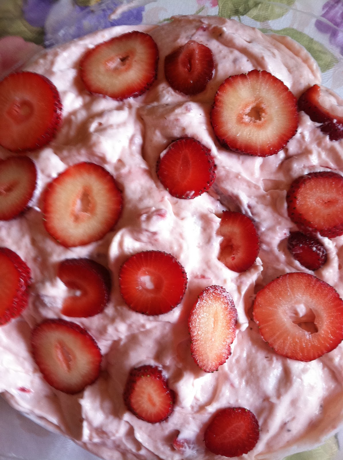 Whisk the yogurt and pudding together in a large bowl, fold in the strawberries with a spatula, then gently stir in the whipped topping. Refrigerate at least an hour before serving. Makes 8-10 servings.