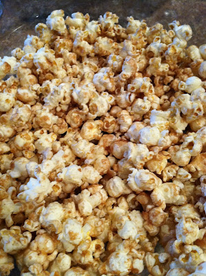 Melt the butter in a small pan over low heat. Add the sugar, salt, cinnamon, and water. Stir until the sugar has dissolved, make sure you keep your heat low so it doesn't burn. Just before it starts to boil, it will start expanding, remove from the heat and pour over the popcorn. I used 2 large bowls and stirred the half of the mixture in each bowl and stirred it with my Pampered Chef spatula to coat the popcorn. Once the popcorn is coated, spread it over 2 large cookie sheets covered with parchment paper. Bake in a 300F oven for 10 minutes. Remove from the oven, let it cool, break it up a little, and start snacking!