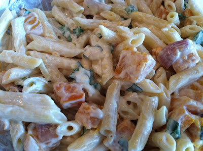 Boil your penne pasta in a large pot of salted (using Kosher salt) water. Cook the pasta so it is still a little firm when you bite into it. Mine took about 10 minutes. I did not drain my pasta but used a slatted spoon to remove the pasta from the pan. Place the goat cheese in a large glass serving bowl, then spoon the pasta over the goat cheese, the cheese will start to melt. Start adding some pasta water, I used a little more than a cup. Stir the pasta and goat cheese with a spatula or wooden spoon. It should turn into a creamy sauce, then add your baked veggies and the basil. Gently stir to mix and season with salt and pepper to taste. That's it! Enjoy!