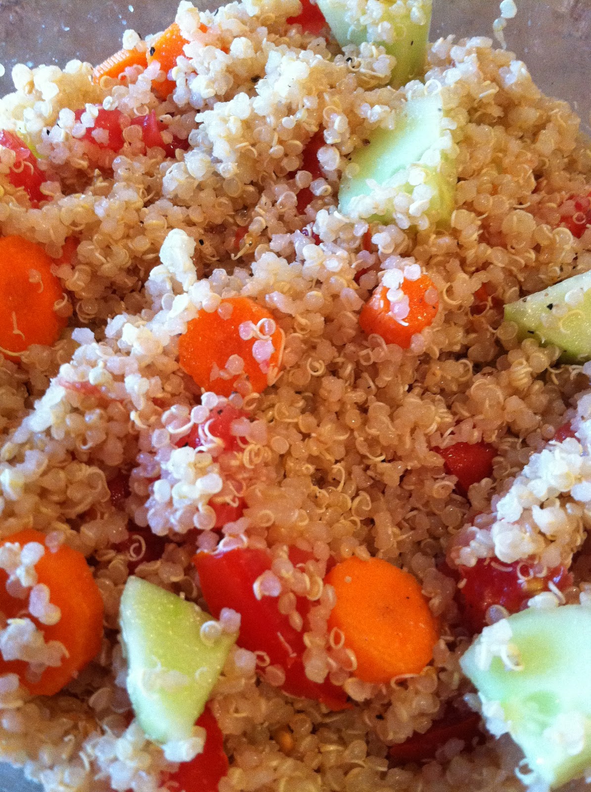 So the other day I was strolling through the grocery store and one of the food samples was Quinoa Salad. I knew it was my lucky day, usually it seems they strategically place the greasy, cardboard-looking frozen pizza in my way! (maybe it's good pizza - I don't know, I've never tried it...but anyway). The store chef told me he used a little olive oil, some fresh veggies and some pepper. So I tried his version and of course I added a few more herbs, because I like them!