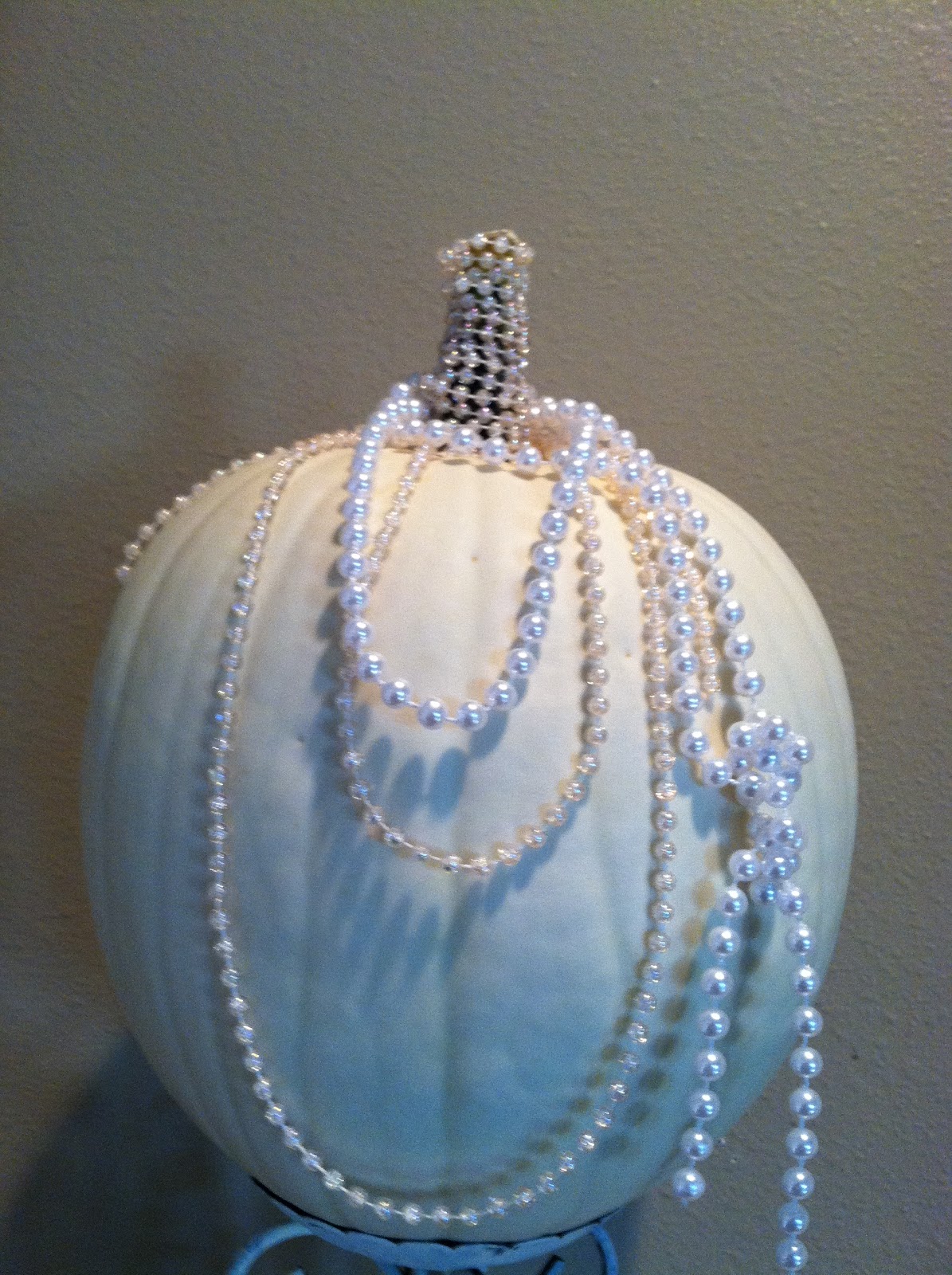 - I started with the real pumpkin first because it had the least work. I cleaned it with water and added some pearls around the top and wrapped the stem in pearl-like beads.