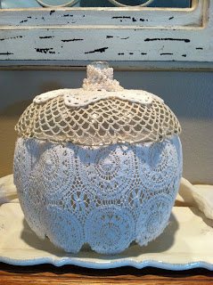 It's time to decorate for fall! I went shopping yesterday looking for the perfect fall decorations and came home with one white pumpkin. I haven't shopped for fall decorations lately and after a couple of hours I knew I needed to go home and start my DIY project. Do people really spend $35 for a fake pumpkin? I love white pumpkins and decided to use different shades of white and textures for my project. I used items from my mantel that I already had and found an old resin pumpkin in my fall decoration box. I also found a cute glass pumpkin that I used for candy and decided I would use that for something. I didn't really know what I was going to do with it yet but a quick call to my sister always helps! After tossing around several ideas, we finally decided I should Mod Podge doilies around it. I grabbed an old cake plate from the donation pile and I was ready to start my decorating project!