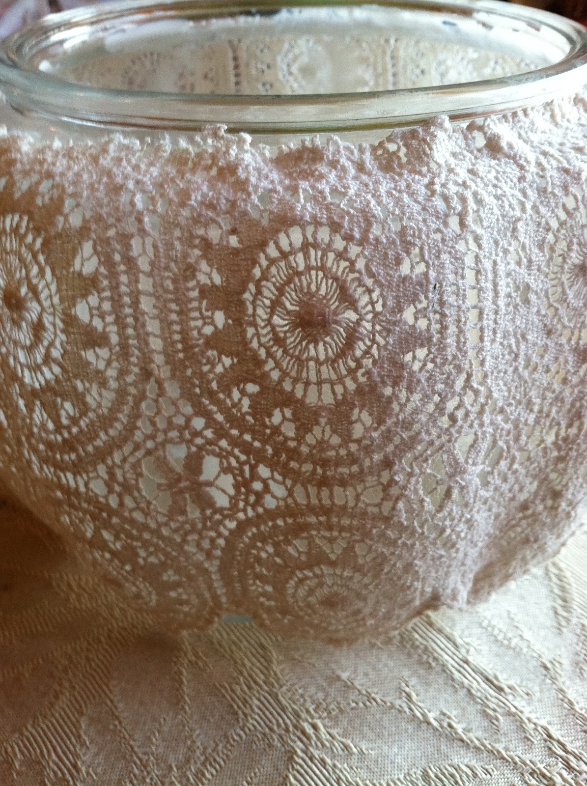 - I started the glass pumpkin base by measuring my doily, I realized I would need to cut it in half. I applied the Mod Podge to the pumpkin base (with a paint brush) and placed the doily over the top. I worked quickly so I could reposition the doily before it started to dry. I did the same thing for the second half of the doily.