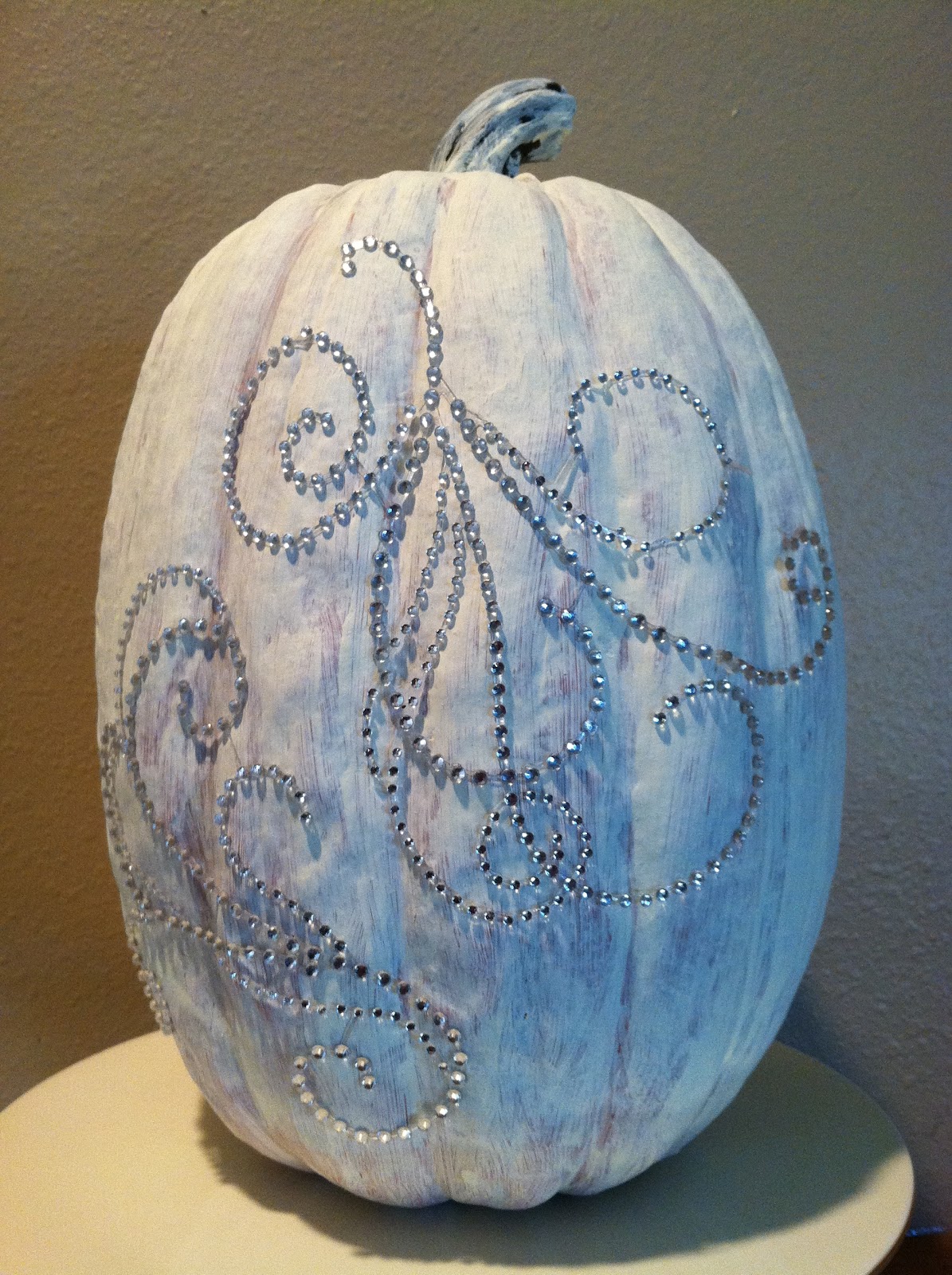 - I painted the old orange resin pumpkin with antique white acrylic paint. When it dried, I applied some crystal bling that I bought at the craft store for $3. It already has adhesive on the back and as long as your paint is dry, it sticks well. I can't help myself - I must have bling!