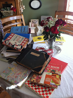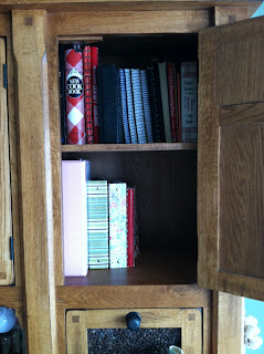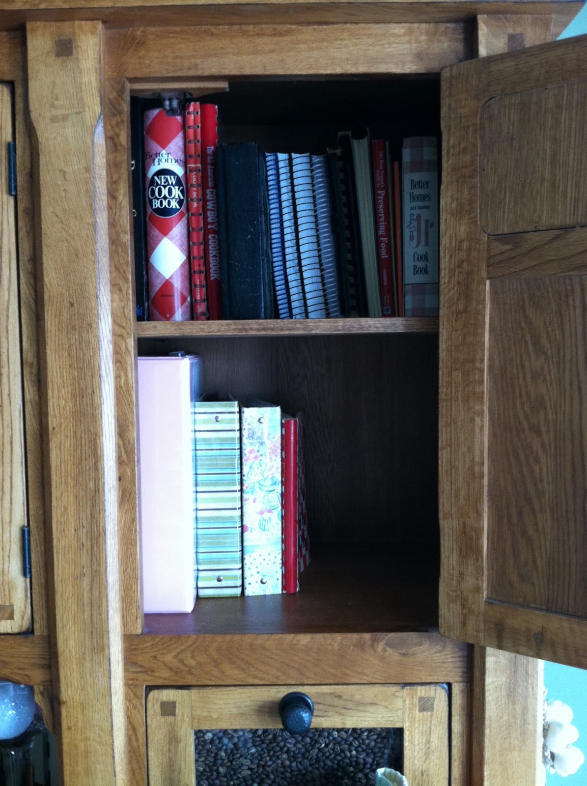 I started this project by giving myself limits. I used the top shelf in the buffet for my favorite cookbooks that I actually use. The bottom shelf is for our blog information and family recipes. My first rule in throwing away was to throw away any loose papers, you know the internet recipes, magazine, newspaper recipes or those free recipe brochures that I've picked up at the grocery store. Next were the recipe books that I haven't touched in the last year (or ever), I am donating those. Remember to picture what you want it to look like in the end. By the time I was finished I was left with only the items that I use or those that have a special meaning to me.