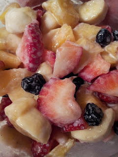 I am officially ready for spring! I'm ready for the snow to melt, the temperatures to warm and I want to play in the dirt! I decided to bring some spring into our menu today by making a simple fruit salad. You can use your favorite fruit, I'm using what's available for now. In the summer, I add watermelon, honey dew melon and fresh papaya. Many thanks to Angie for taking the picture, I ended up getting distracted and forgot until my salad was gone!