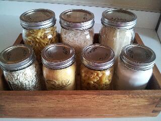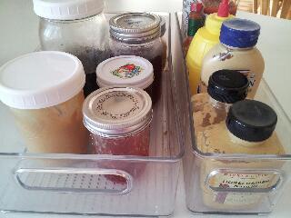 I bought some Peter Walsh fridge bins at Costco. I found similar ones at other stores and online also. They come in lots of different sizes. It's handy to put things in groups like you use them. My condiments like mustard, ketchup, hot sauce, etc. are in one bin. The peanut butter, jellies and syrup are in another one. So when you are serving something you can take out the whole bin instead of a bunch of separate containers. You also avoid the "sticky shelves" in your fridge! I put things that I use most like rice, pasta, and dry beans in jars and store them in an old wooden box. I keep that on my counter next to my stove. It's also helpful for family members or visitors, so they don't have to look through all the cupboards to find things to cook something.